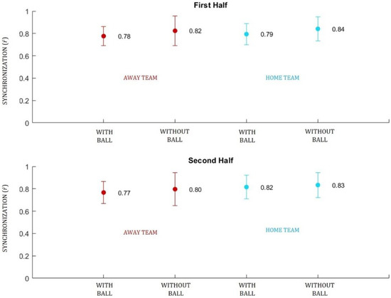 Figure 2 shows that the overall synchrony measures for both teams were high (near 1) and that the home team (blue) presented higher mean synchrony values in both halves and roles: first half, with ball (0.79 ± 0.09); first half, without ball (0.84 ± 0.11); second half, with ball (0.82 ± 0.11); second half, without ball (0.83 ± 0.11).