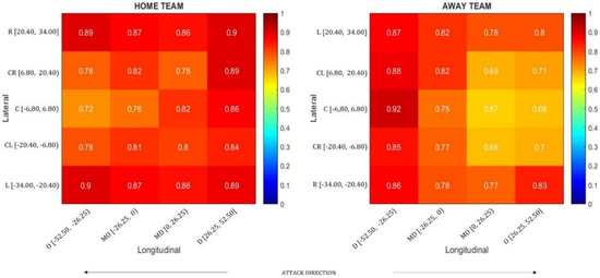 Figure 3 represents the football pitch, divided in 20 zones (5 lateral and 4 longitudinal). The lateral and longitudinal coordinates, that limited each zone, are represented in meters on the y and x axis, respectively. The color of each zone represents the scale of synchronization in which colors tending to red represent higher mean synchronization and colors tending to blue represent lower mean synchronization values.