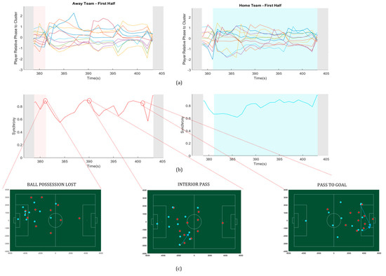 Variations of the order parameter (synchronization) and the player relative phase to the team, during a specific time frame (30 s) in the first half of the match. (a) Relative phase of each player to the team, in both teams; (b) synchrony () measures for each team. The grey background indicates that the game is not running. Red or blue background indicate when the away team (red) or the home team (blue) have possession of the ball and white background indicates that the team does not have possession of the ball; (c) exemplar key events of the match that are expressed by three apexes of the synchronization values, circled in red on the left-side (away team).