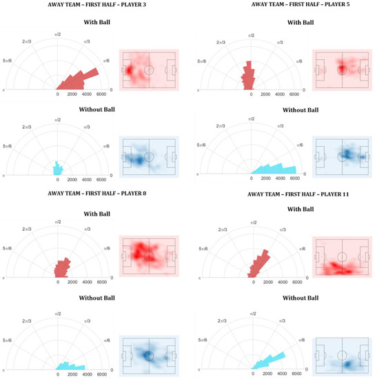 Figure 5 shows that some players had a higher relative frequency in a specific PBGA range while others had a more varied amplitude of PGBA but lower relative frequency values. For the away team the total number of frames (at 25 Hz) in the first half, in which the match was running and the team had the ball, was 24,992 and without the ball was 16,774. Therefore, the polar graph of player 5, for example, shows that when the team did not have the ball, his PBGA was almost always close to 0 (relative frequency = ±6000) and ranged only from 0 to π/6 (30°). This means that from the total amount of time (frames) that his team did not have the ball, player 5 spent approximately 36% of the time in between 0 and 0.174 (10°). A PBGA close to 0 means that the player was in a position almost exactly between the goal and the ball.