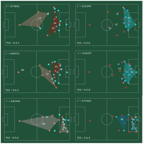 Convex hull of each subgroup in each configuration, in three selected frames of the match. Left: configurations of the team with ball (red). Right: configurations of the team without ball (blue). Subgroups are represented by the codes: FS/C—Front Support/Cover; LS/C—Lateral Support/Cover; BS/C—Back Support/Cover. On the top-left corner of each frame there is the synchronization () value and on the bottom-left corner, the team configuration code (TCC). The ball is represented by a white filled circle.