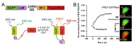 Calcium is an important signaling molecule, playing a significant role in neuronal function [1,2], determining cell development [3,4,5], controlling synaptic plasticity [6], and regulating tumor progression [7]. Therefore, the intracellular concentration of Ca2+ is tightly regulated and the precise measurements of spatiotemporal dynamics of Ca2+ may unveil crucial biochemical activities. Numerous Ca2+ indicators have been developed by many research groups. Synthetic fluorescent chelators were used to measure intracellular Ca2+ concentration [8,9,10]. Chelators are easy to image but they are not targetable to specific organelles and less bright. To address this, a genetically encoded fluorescence resonance energy transfer (FRET)-based Ca2+ biosensor (BS) was developed using donor and acceptor fluorescent proteins, Calmodulin (CaM), and CaM-binding peptide M13 [11]. As Figure 1A describes, four Ca2+ bind to CaM, which induces conformational changes to a compact form. The relative distance and orientation of two fluorophores decrease, resulting in FRET increase. FRET BS has been revolutionized many fields including Ca2+ signaling, caspase activation, and in vivo optogenetics [12,13]. Since then, FRET Ca2+ live cell imaging has advanced [14]. Single fluorescent protein (FP)-based genetically encoded intracellular Ca2+ indicators have also been widely used such as GCaMP [15]. Further advances on the development of single fluorescent protein-based indicators have been achieved. For example, GCaMP6 has increased sensitivity and fast kinetics [16], and RCaMP [17] and R-GECO1 [18] are compatible with other reporter constructs with GFP signal.