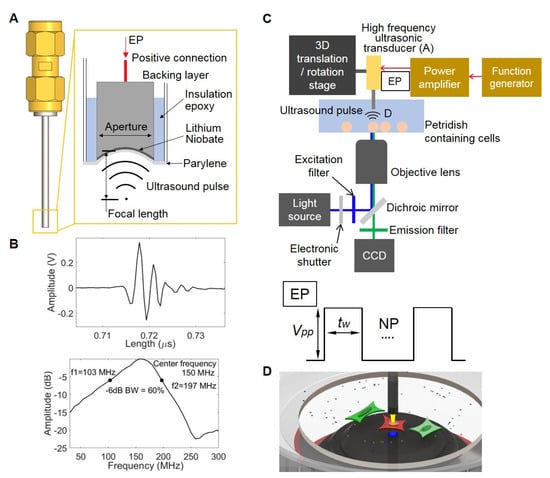 The 150 MHz high frequency ultrasonic transducer was developed using a conventional tran111sducer fabrication protocol [31,32]. Briefly, lithium niobate (LibNO3) was slapped down to 10 μm. Conductive backing layer was cast on one side of lapped LibNO3 before focusing. LibNO3 with backing layer is called acoustic stack (Figure 2A). Circular aperture was 1 mm in diameter. While heating the acoustic stack in a 90 °C oven, backing layer became soft and provided a structural integrity during the press focusing with a 2 mm diameter ball to make focal length of 1 mm (Figure 2A). The press focused acoustic stack was securely placed at the distal end of a 1.6 mm stainless-steel needle using insulation epoxy. LibNO3 with the thickness of 10 μm was designed to generate 150 MHz ultrasound pulse. Pulse echo was tested using a quartz target and measured center frequency was 150 MHz as shown in Figure 2B from a spectrum of echo signal. The schematic diagram depicting a system for single cell stimulation and the intracellular delivery using high frequency ultrasound is shown in Figure 2C [27]. The developed transducer (Figure 2A) was attached to a 3D translation/rotation stage to precisely locate the focus of the ultrasonic transducer for the intracellular delivery of FRET biosensors and the stimulation of target cells (Figure 2D) [27]. A function generator and a power amplifier were used to transmit an electrical pulse (EP) to trigger LibNO3 for ultrasound pulse generation. Peak-to-peak voltage (Vpp) and pulse width (tw) were adjusted by a function generator for intracellular delivery or stimulation. Throughout the Ca2+ influx stimulation experiments, Vpp and tw were 22 V and from 5 μs to 10 μs, respectively.