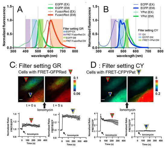 We have developed a new FRET-based Ca2+ biosensor (BS) using a new fluorophore pair by combining EGFP and FusionRed (FRET-GFPRed). FRET-GFPRed requires filter settings different from those of the typical FRET-based Ca2+ BS with ECFP and YPet (FRET-CFPYPet) [20,22]. FRET-GFPRed has a central biosensor piece containing Calmodulin (CaM), a flexible linker peptide, and M13, which are concatenated between EGFP and FusionRed (Figure 1A). Figure 1B indicates ionomycin stimulation using FRET-GFPRed and we used filter setting GR in Figure 3A. The spectral overlap between EGFP and FusionRed is shown in Figure 3A. The FRET-CFPYPet spectra between ECFP and YPet and the microscope filter setting CY are shown in Figure 3B. The quantum yields of EGFP and FusionRed are 0.60 and 0.19, respectively, and the extinction coefficients of EGFP and FusionRed are 56 mM−1cm−1 and 94.5 mM−1cm−1, respectively [23,33]. Relative brightness of FusionRed to EGFP is 53% (quantum yield multiplied by extinction coefficient). We speculated that the exposure time of FusionRed should be longer than that of EGFP for proper FRET-FusionRed/EGFP ratio imaging. We tested this hypothesis to optimize the filter setting GR for FRET-GFPRed by acquiring FRET-FusionRed/EGFP ratio at three filter settings (Supplementary Figure S1). The optimized filter setting GR was found to be EGFP EX 470/40, EGFP EM 525/50 combined with dichroic 495 and FRET-FusionRed EX 470/40, FRET-FusionRed EM 650/100 combined with dichroic 595 (Figure 3A). The exposure time ratio of the FRET-FusionRed channel to the EGFP channel using the filter setting GR was five. FRET-GFPRed was transfected into HeLa cells and stimulated with ionomycin to induce a FRET response due to increased levels of intracellular calcium [34]. FRET-GFPRed consistently exhibited a 10–15% increase in FRET-FusionRed/EGFP ratio using the filter setting GR, as shown in Figure 1B.