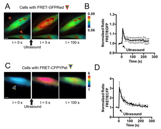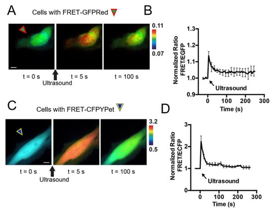 The ultrasound system for the intracellular delivery and stimulation was integrated with a Nikon fluorescence microscope for FRET imaging (Figure 2C). Images were collected with a Nikon microscope and a cooled charge-coupled device (CCD) camera using the MetaFluor 6.2 and MetaMorph software packages (Universal Imaging, Downing town, PA, USA). The filter setting GR in Figure 3A for EGFP/FusionRed pair consisted of EGFP EX 470/40 and EGFP EM 525/50 combined with EGFP dichroic 495 and FRET-FusionRed EX 420/40 and FRET-FusionRed EM 650/100 combined with FRET-FusionRed dichroic 595. The exposure time of FRET-FusionRed was five times longer than that of EGFP. The filter setting CY for ECFP/YPet pair in Figure 3B contained EX 420/40, ECFP EM 480/40, and YPet EM 535/30 combined with dichroic 455. The RFP filter set consisted of EX 560/40 and EM 630/75 combined with dichroic 585 to distinguish cells transfected with FRET-GFPRed or FRET-based Ca2+ BS with ECFP and YPet (FRET-CFPYPet). We collected five channels sequentially using filter setting CY and GV. As shown in Figure 3A,B, acquired channel data are EX-ECFP EM of filter setting CY for channel 1, EX-(FRET-YPet EM) of filter setting CY for channel 2, EGFP EX-EGFP EM of filter setting GR for channel 3, EGFP EX-(FRET-FusionRed EM) of filter setting GR for channel 4, and differential interference contrast (DIC) for channel 5. A neutral density filter was used to control excitation light intensity. The fluorescence intensities of non-transfected cells were quantified as background signals and were subtracted from the donor and acceptor signals detected from the transfected cells. MetaFluor was used to calculate the pixel-by-pixel ratio images of FRET/ECFP and FRET/EGFP based on the background-subtracted fluorescence intensity images and calculate standard deviation (SD) and standard error of the mean (SEM) of FRET responses. The emission ratio images were shown in the intensity modified display (IMD) mode [19].