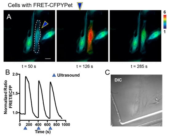 Currently, chemical stimulation has been widely used to induce molecular events that can be detected by FRET BS. However, chemical stimulation affects whole populations of cells in a dish, and is very difficult to induce subcellular stimulation within cells and trigger repeated stimulations to the same cell. Previously, to apply mechanical force, optical tweezers were used to transmit trapping force into a cell or subcellular locations by coupling a bead and a cell surface [19,24,25]. However, the apparatus for realizing optical tweezers is very bulky and expensive. Beads provide another complication to this method. To address these difficulties, we have developed a 150 MHz high-frequency ultrasound (HFU) to directly manipulate target single cells without beads or microbubbles. Electronics to control HFU are much cheaper than components of laser-optics. Single cell targeting and manipulation can be realized by HFU due to its focusing ability. When the frequency of HFU exceeds 150 MHz, the size of the focal area approaches that of a subcellular region smaller than 10 μm [26,27]. HFU can be used to mimic the physiological cues that trigger changes in gene expression and cell behavior. For example, HFU can serve to generate microstreaming around cells, to stretch a cell’s lipid bilayer, and to push cell membranes directly for an extended time without coming into contact with the cells. Different types of cells experience different mechanical stimuli. Red blood cells, endothelial cells, and somatosensory neurons experience various types of forces during circulation [28], blood flow-induced shear stress [29], and tactile stimuli [30], respectively. Therefore, HFU provides mechanical stimuli to activate the release of Ca2+ from endoplasmic reticulum within the cell or introduce Ca2+ via mechanotransduction ion channels. Direct disruption of cell plasma membrane by HFU can introduce Ca2+ and DNA or protein for the intracellular delivery [26,27]. Because disrupting cell plasma membrane does not occur in real situation, we will further improve our technique to directly stimulate organelles and induce channel opening via HFU without disruption in the future.