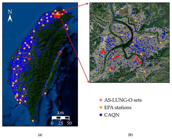 Distribution of AS-LUNG-O sets, Environmental Protection Administration (EPA) stations, and sensors of the citizen air quality network (CAQN) in (a) the whole of Taiwan island, (b) the Taipei metropolitan area from July 2017 to December 2018, and (c) an AS-LUNG-O set at street level.