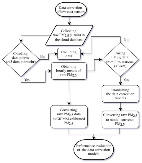Figure 2 shows a flow chart of the data correction process. Raw PM2.5 readings with a 1 min resolution were averaged to their hourly means to match the hourly observations from the nearest EPA stations within a 3 km radius. If the numbers for the raw PM2.5 in one hour were less than 45, this hourly mean was discarded. After collecting all aforementioned input data, data correction models with three different methods can be established. A model-corrected PM2.5 based on the optimal correction model can be obtained and then compared with the GRIMM-calibrated PM2.5 corrected based on traditional laboratory evaluations. In this way, the performance of the PM2.5 correction model can be evaluated accordingly.