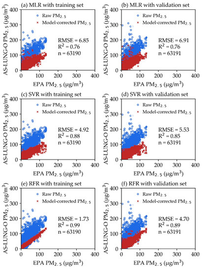 The focus of this work was to establish and evaluate three in-field data correction models for a PM2.5 LCS network—namely, the MLR, SVR, and RFR models. The AS-LUNG-O network, with individual correction equations for each LCS in the laboratory, offers a great opportunity to assess the performance of the data correction models established by machine learning techniques. Based on the results of the 10-fold cross-validation and holdout validation tests, there was only a little difference between the RMSEs of the 10-fold cross-validation and holdout validation tests for MLR, SVR, and RFR. Thus, to avoid overvaluing the performance of the models, we used the holdout validation to establish our models. Among them, RFR is the best model, with an RMSE of 1.73 and an R2 of 0.99 based on 63,190 raw hourly data of 39 AS-LUNG-O sets corrected with the PM2.5 levels of EPA stations located within a 3 km radius. In the validation set, RFR was not overfitted, and the data corrected with the RFR model agreed well with the EPA observations. Thus, RFR was chosen as the data correction model. This work demonstrated the applicability of RFR in correcting LCS networks. Previous studies used statistical and machine learning models with data from regulatory stations to correct side-by-side LCS sets on the same locations [15,30]. This work is the first to use data from monitoring stations to correct the data of the LCS network in other locations without monitoring stations. This work is unique in providing LCS data (GRIMM-calibrated PM2.5) based on laboratory evaluations for comparison in other locations.