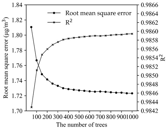 To optimize the computing efficiency of the RFR model, a sensitivity analysis of RFR was conducted with 50 to 1000 decision trees (with 50-tree increases in each simulation) to assess the changes in modeling efficiency. Figure 4 shows that RFR offers good model performance (RMSE = 1.81 and R2 = 0.9843) when there are only 50 trees. As the decision trees increase, the modeling efficiency is enhanced most significantly before the number of decision trees reaches 300. When the decision trees number is 300, the RMSE is 1.73, and the R2 is 0.9858. Afterward, the efficiency enhancement is not significantly altered by adding more decision trees, which takes more computing time. In the overall evaluations, RFR with 300 decision trees was chosen as the model with the best efficiency.