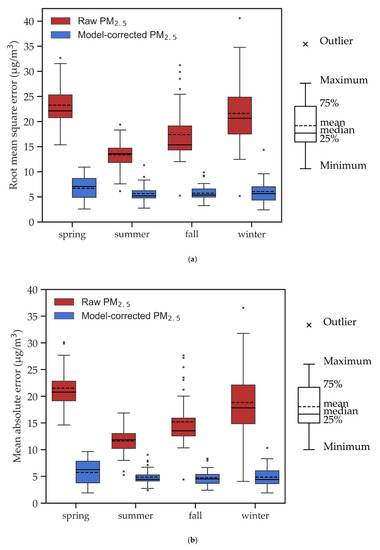 In addition, the MAE is used to evaluate the performance of RFR compared to the models in the literature. Figure 5b shows MAE values between the model-corrected PM2.5 and GRIMM-calibrated PM2.5 with RFR (nighttime pattern). The MAEs were 1.9–9.6 (mean 5.7), 2.4–9.0 (mean 4.9), 2.4–8.3 (mean 4.8), and 1.9–10.3 (mean 4.9) μg/m3 for spring, summer, fall, and winter, respectively. Before the model correction, the MAE values were 14.6–30.1 (mean 21.5), 5.3–16.9 (mean 11.6), 4.4–27.6 (mean 15.2), and 4.1–36.6 (mean 18.8) μg/m3 for spring, summer, fall, and winter, respectively. In summary, after correction, the RMSE was improved from 18.4 ± 6.5 to 5.9 ± 2.0 μg/m3, and the MAE was improved from 16.2 ± 6.0 to 5.0 ± 1.8 μg/m3. This demonstrates that the RFR model greatly reduces MAEs, lowers the overestimation of AS-LUNG-O raw data, and improves the agreements between AS-LUNG-O and EPA PM2.5 levels.