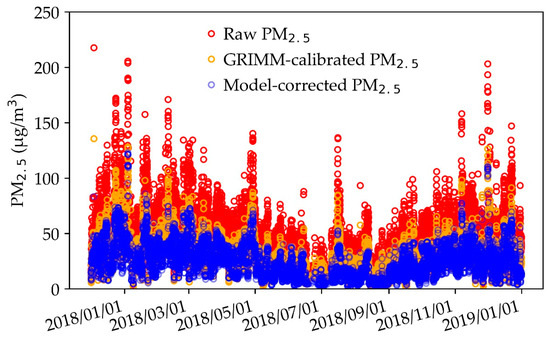 Time-series of raw PM2.5, model-corrected PM2.5, and GRIMM-calibrated PM2.5.