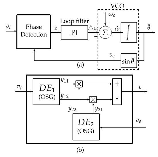 A classic PLL has three parts: phase detector (PD), loop filter (LF), and a voltage-controlled oscillator (VCO), Figure 1a. A simple multiplier could be used as a PD. However, higher harmonics will be generated [22]. To overcome this issue, an orthogonal signal generator (OSG) is used to generate two orthogonal signals. Due to orthogonality, harmonics in the output of PD are now eliminated.