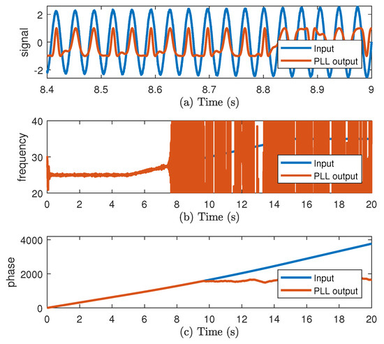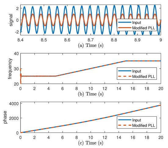 (a) Input and Phase-Locked Loop (PLL) sinusoidal output , (b) frequency, and (c) phase.