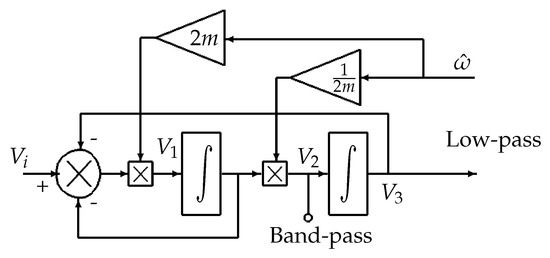 The structure of the PLL is modified in order to have a better performance. The first improvement is to use adaptive filters. The state variable structure shown in Figure 3 could create two filters: bandpass and low-pass. The filters are tuned using the estimated instantaneous frequency.