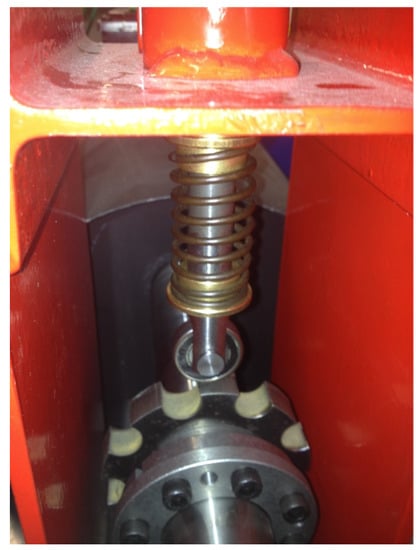 The machines have pole pairs. The PMSG is driven by a PMSM through a gearbox with 4.57 ratio. The motor is controlled through a variable speed drive. The generator is connected to a passive load. Current measurements are collected via a dSPACE-DS1104 acquisition card with a sampling frequency kHz. The rotor position is also collected to compare the results. In Figure 8, a mechanical system is designed to simulate the fault. As mentioned before, mechanical faults generate either variations of torque or variations of eccentricity. The emulator makes it possible to simulate the resistance torque variations (for low impacts) and the air gap variations (for strong impacts). The system is mounted between the motor and the gearbox (low speed part). A vertical roller impacts a sprocket of 9 teeth. This interaction generates 9 impacts per turn. The vertical axis could be controlled to change the force of the generated fault.