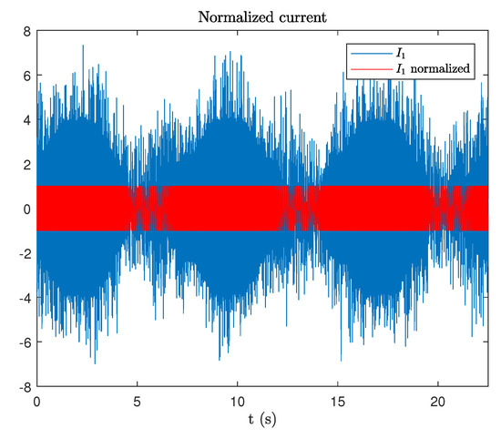 In order to verify the method, a test is realized with variable speed. The electrical frequency of the generator current changes approximately 30 Hz between 10 Hz and 50 Hz with a cycle of 7.5 s. In this test, the data of three cycles with total duration of 22.5 s are collected. Using the current , an amplitude normalization is performed at the input stage, see Figure 9.
