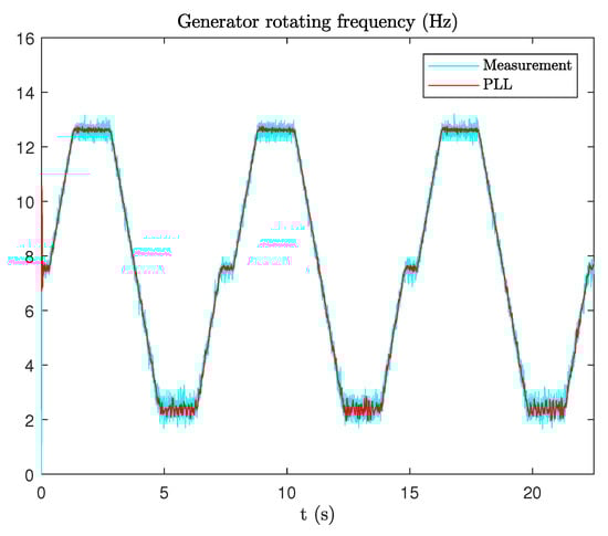 After normalization, the PLL will estimate the phase and the electrical angular frequency using the normalized current. The central frequency of the PLL is set to rad/s. and are set using Equation (15). For and , the parameters are set to and , respectively. As mentioned before, , so the mechanical rotating frequency of the generator is 1/4 its electrical frequency, which means it will change between 2.5 Hz and 12.5 Hz. The estimated frequency and the measured one are shown in Figure 10.