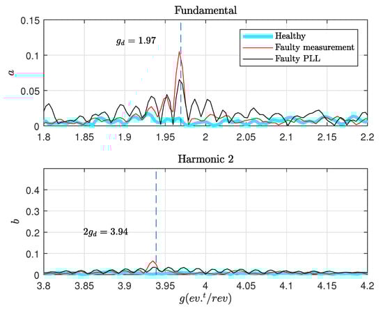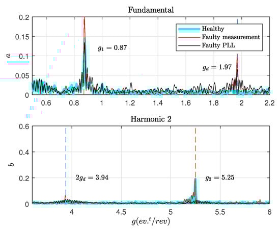 The estimated phase is then used to resample the estimated frequency . The online resampling is executed with an angular step rad; the Fast Fourier Transform FFT of the new signal is calculated. The angular spectrum for both healthy and faulty measurements are shown in Figure 11, it is represented in events per rotor revolution. The default generates nine impacts per revolution at low speed side. On the other side of the gearbox (generator side), the number of impacts generated is = 9/4.57 = 1.97 impacts/rev. The two components and are related to the gearbox, they are presented in healthy and faulty conditions.