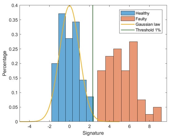 In order to validate the statistical approach, the same test bench of Section 4 with the same conditions are used. In the training phase, recordings are collected. Each recording represents one speed cycle with a duration of 7.5 s. The fault signatures are calculated. The normalized reference is then created. The threshold of a probability of equals 2.33. In Figure 13 and Figure 14, the distribution of normalized signatures and the threshold are shown. In the diagnosis phase, 50 other recordings are collected for faulty conditions.