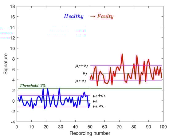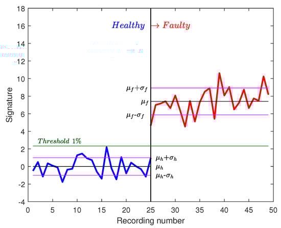It is noted that the threshold separates healthy from faulty signatures. Those signatures are calculated with FFT on one speed cycle. In order to improve this approach and decrease the risk of launching false alarms, new signatures are calculated on two cycles for a duration of 15 s. In Figure 15, 25 healthy recordings of two cycles are shown as well as 25 faulty recordings. It is noted that the difference between healthy and faulty signatures is bigger. A more reliable threshold could be defined now ( for example).