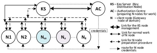 - N1, N2, … Nk nodes—the representative for domains for whom symmetrical keys will be created;