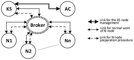 Nodes of the KGR system will form the Key Exchange Domain (KED). There will be one KS node, one AC node and many N-type nodes in the KED domain. The Broker node will act as a data exchange intermediary between these nodes. The KED domain structure is shown in Figure 4.