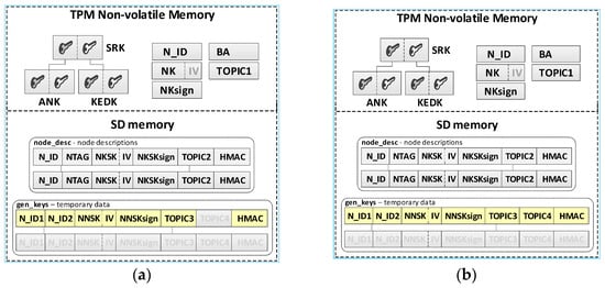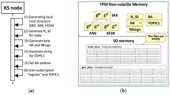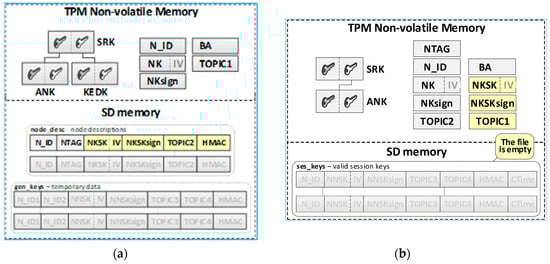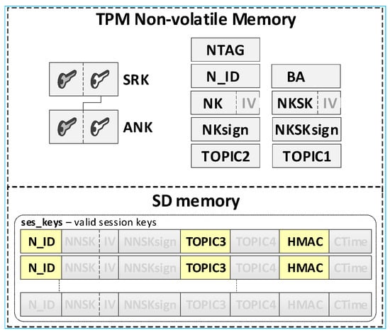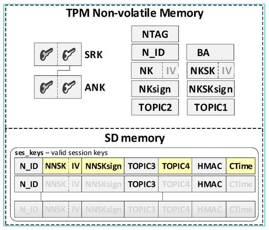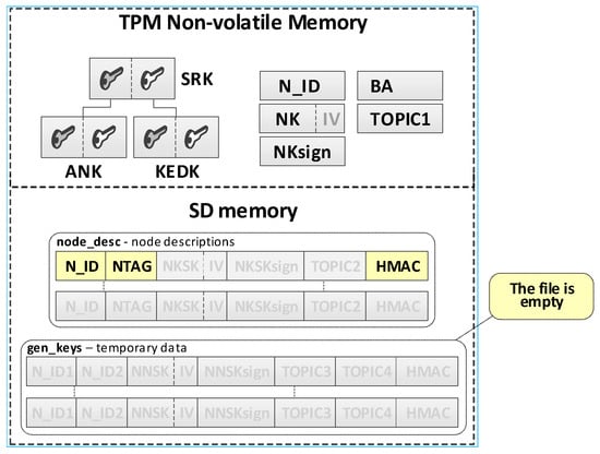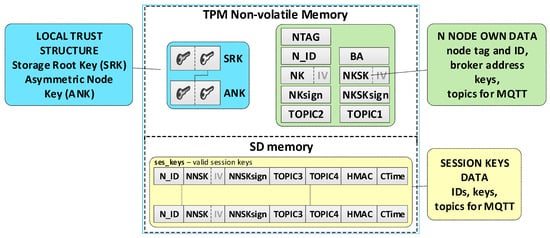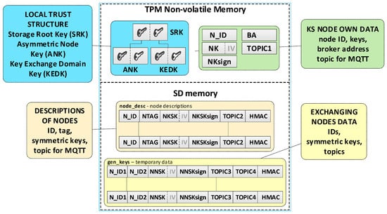 It was assumed that this KS node’s own data and its local trust structure will be stored in the TPM NVRAM installed on the node. KED domain description data and sensitive temporary data will be stored in the node’s SD memory. All mentioned data will be cryptographically secured using TPM mechanisms. The data stored on the KS node are shown in Figure 5.