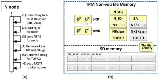 Because the KGR system is mainly intended for IoT network nodes, which usually use wireless links to exchange data, the risks specific to such networks were considered in the security analysis. In most cases, sensor network nodes are unattended and can be an easy target for attack. For this reason, the following attacks will be considered: malicious sensor node injection (node replication attack), sensor impersonation (imitation), attacks on the information in transit, DoS attacks, and routing attacks []. The presented solution uses selected mechanisms offered by TPM to counteract these attacks. These include: securing cryptographic keys through a hierarchy of keys, creating a local trust structure, using PCR registers to detect attempts of unauthorized modification of data, software and hardware configuration of the sensor node, cryptographic protection of data stored in sensor node resources (in SD and NVRAM memory), and determining the value of the HMAC function for transmitted and stored data to ensure data integrity. The following sections also present what TPM mechanisms have been used for this purpose.