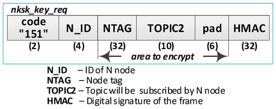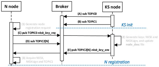 - TOPIC1—topic subscribed by KS in the MQTT service used to initiate the generation and renewal of session keys by N nodes, common to all registered N nodes (10-byte random string generated by the KS node).