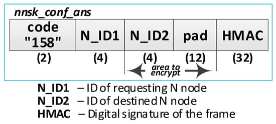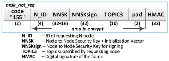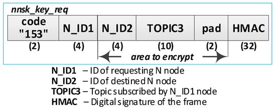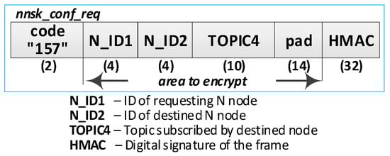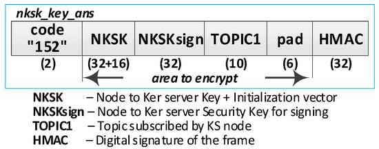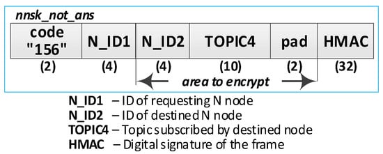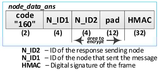 - Publish a response to the data packet frame to the N_ID1 node (node_data_ans packet showed in Figure 33) using topic TOPIC3 subscribed by the N_ID1 node for exchange data session with the N_ID2 node. The field N_ID2 is encrypted using the NNSK session key for a pair of nodes N1 and N2, the HMAC is determined for all fields of the packet using common NKSKsign.