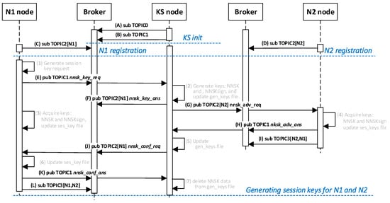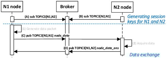 The sequence diagram of the data exchange in the MQTT service for the procedure of generating the session keys for N1 and N2 nodes is shown in the Figure 29.
