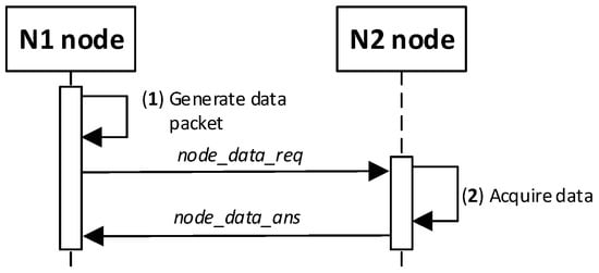 The data exchange protocol between the N1 and N2 nodes for which session keys were generated depends on how the two nodes cooperate and is established outside the key generation/renewal system. This topic is not the content of the study. For this reason, to demonstrate the operation of the KGR system, a simple transmission of a 12-byte character string from node N1 to node N2 will be shown as well as sending a response frame. The way the N1 node and the N2 node work together during this experiment is shown in Figure 30. The sequence diagram for the procedure is shown in Figure 31.