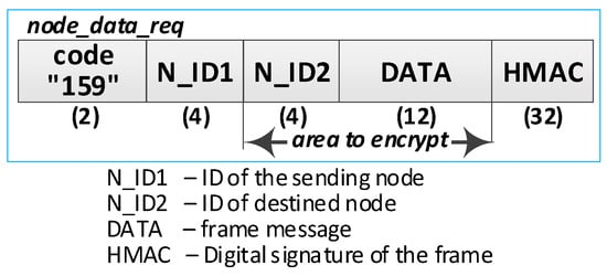 - Prepare the node_data_req packet (Figure 32) containing the following data: N_ID1 (ID of sending node), N_ID2 (ID od destination node), and DATA. The N_ID2 and DATA fields of the packet are encrypted using the NKSK session key common for N_ID1 and N_ID2 nodes; the HMAC is determined for all fields of the packet using also common NNSKsign;