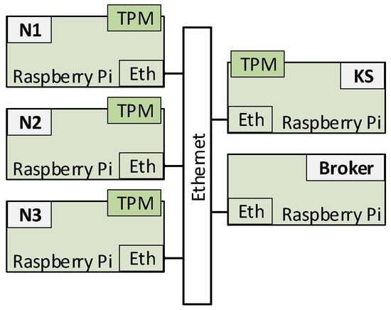 The presented concept has not yet been fully verified. However, attempts were made to examine a very simple version of the cryptographic key generation system that met the selected requirements described at the beginning of Section 3.1. The design and demonstrator of this version were described in []. The prepared demonstrator included three N-type nodes (N1, N2, and N3), a KS node, and an MQTT broker node (AC node not implemented). All nodes were implemented using the Raspberry Pi 3 Model B board. Nodes N1, N2, and N3 and the KS node were additionally equipped with a LetsTrust TPM module containing the Infineon Optiga ™ SLB 9670 TPM 2.0 chip and 32GB SD memory (Figure 35). OASIS MQTT Version 3.1.1 was used to support the MQTT protocol. An Ethernet interface was used for data exchange. The structure of the demonstrator is shown in the Figure 36. The demonstrator software was prepared with the use of Python and the IBM TSS 1470 library.