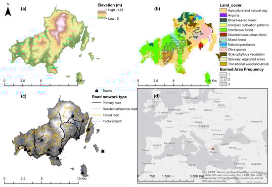 (a) Elevation, (b) land cover and burned areas, (c) spatial distribution of road and human settlements network, and (d) geographical position of Skiathos Island.