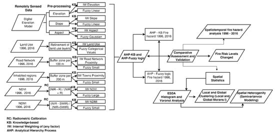 The methodology of the study consists of three parts. The first is related with the comparative analysis and assessment of two robust fire hazard estimation techniques, namely, the AHP-knowledge-based and AHP-fuzzy logic modeling of the most contributing factors. Next, a validation approach would allow the selection of the most representative technique based on real fire history data. Finally, a spatiotemporal and geostatistical analysis of the selected model is conducted in a timeframe of 20 years (1996–2016) in order to reveal the underlying spatial patterns of fire hazard. Figure 2 summarizes the flowchart of the adopted methodology.