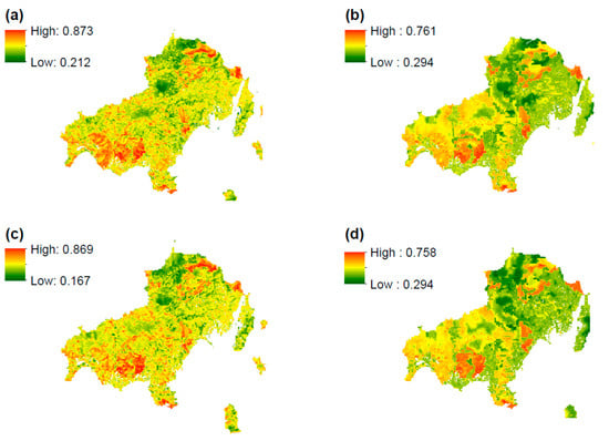 (a) AHP-knowledge-based fire hazard map for 1996, (b) AHP fuzzy logic fire hazard map for 1996, (c) AHP-knowledge-based fire hazard map for 2016, and (d) AHP fuzzy logic fire hazard map for 2016.