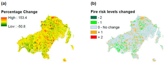 Next, the change of fire hazard levels was computed as an additional index of fire hazard. The class intervals were determined in exactly the same thresholds for both maps in order to allow comparability and fire hazard transition.