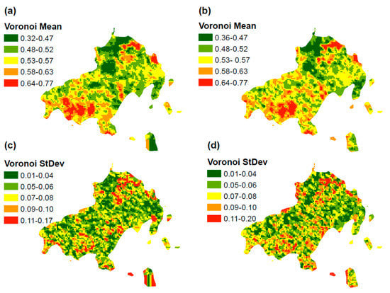 (a) Voronoi mean map 1996, (b) Voronoi mean map 2016, (c) Voronoi standard deviation map 1996, and (d) Voronoi standard deviation map 2016.