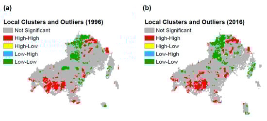 (a) Local Indicators of Spatial Association 1996, and (b) Local Indicators of Spatial Association 2016.