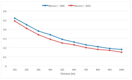 Figure 7 shows a similar tendency for both fire hazard maps, where Moran’s I values decrease as the distance increases. In the last 1000 m, the Moran’s I values for 1996 and 2016 are 0.18 and 0.15, respectively. The Moran’s I index for 1996 is always higher than the index for 2016, indicating that the spatial autocorrelation is extended to a greater distance than the corresponding value of 2016.