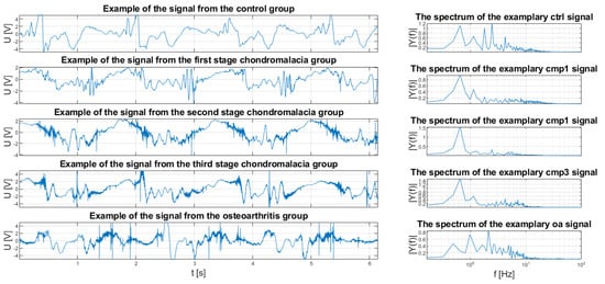 Exemplary VAG signals, generated by knee joints with different conditions were presented in Figure 1. Conditions included in the Figure and in the rest of this paper are as follows: control group (healthy knee joint, abbreviated as ctrl), three stages of chondromalacia patellae (cmp1, cmp2, and cmp3, consecutively), and osteoarthritis (oa). As it can be seen, a lot of information about the specific condition could potentially be embedded in the frequency spectrum of the signal.
