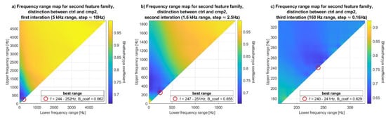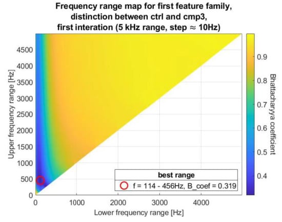In the FRM, the abscissa x-axis is the lower frequency range and the ordinate is the upper frequency range. As a result, in the first iteration, only the upper-left half of the map consists of possible results. Applicate, or color, indicates quality of feature, defined as the Bhattacharyya coefficient. Similar maps were defined and used in [], but with lower resolution and for slightly different features. The z-axis, or feature evaluation coefficient used in [] was the area under the ROC curve, not the Bhattacharyya coefficient. Consequently, the coefficient in [] was maximized, not minimized.