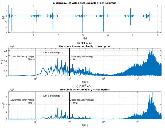 - squared DFT of the derivative of the VAG signal, from which the fourth feature family is obtained, using Equation (7).