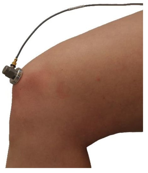 For the purposes of this research, VAG signals were acquired from groups of patients qualified by specialists as having first stage chondromalacia (cmp1), second stage chondromalacia (cmp2), third stage chondromalacia (cmp3), and osteoarthritis (oa) and from the control group, healthy knee (ctrl). All subjects underwent routine medical interviews, physical examination, and imaging via MRI. Patients with stages I–III of chondromalacia patellae were classified in accordance with the Outerbridge classification []. In turn osteoarthritis (OA) patients were diagnosed with mild to moderate knee OA (grade II and III according to the Kellgren-Lawrence grading system []) with a disease duration of more than 2 years. All imaging examinations were analyzed by single radiologist, who was blinded to patients’ symptoms. To prevent any signal artifacts from deteriorations other than chondral lesions, individuals with a history of knee fracture, knee surgery, history of meniscal tears, significant knee instability, or patellar maltracking were not enrolled in the study. Moreover, due to the methodology of the VAG assessment, individuals with a restricted knee joint range of motion (required 0° to 100°), significantly weakened muscles, and substantially swollen knees in the affected lower limb were excluded from the study. The VAG examination was performed in a sitting position and consisted of exactly four full cycles of alternating extension and flexion of the knee joint (90°–0°–90°) lasting 6 s. Mounted 1 cm above the apex of patella, the acceleration sensor was recording vibration and acoustic processes occurring during the knee movements. The acceleration sensor attachment was shown in Figure 5.