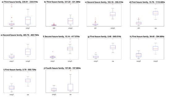 Although frequency analysis is present in literature devoted to vibroarthrography, the state-of-the-art spectral features are designed to distinguish all classes at once [,,,,,], i.e., to utilize a single value to differentiate between specific conditions. The objective of this study was to find better frequency ranges, focusing on the distinction between each particular class pairs (i.e., ctrl-cmp1, ctrl-cmp2, ctrl-cmp3, …, cmp3-oa).