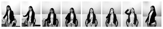 As visual stimuli displayed in an ERP paradigm, eight still images of a Korean woman (Figure 1), who performed eight different actions [32,33] and engaged in head tilts mimicking a human-like robot [34], were prepared and repeatedly used to represent human and human-like AI agents, both of which were only distinguished by word labels placed on the top of the last screen: human and AI. Furthermore, a manipulation check was administered to rule out the possibility that participants would evaluate the naturalness of the two recommended agents based only on their actions and appearance, not based on the symbolic consumption context. In the manipulation check, 31 male participants who are all right-handed (age range, 19–39 years; M = 26.52, SD = 4.34) were recruited from Sejong University in South Korea. After a set of eight images was randomly presented twice in a counterbalanced order (agent, human vs. AI), attractiveness (1, not attractive at all; 7, very attractive) and naturalness (1, not natural at all; 7, very natural) were rated on 7-point scales repeatedly with appropriate anchors within the same respondents, assuming that either of the two different identities was assigned to each image in the set. According to the result of a paired samples t-test, there was no significant difference in the mean scores for the subjective ratings of the two agents: (1) attractiveness (Mhuman = 4.94, SDhuman = 1.00 vs. MAI = 4.71, SDAI = 1.07; t30 = –1.27, p = 0.21) and (2) naturalness (Mhuman = 4.16, SDhuman = 1.55 vs. MAI = 4.42, SDAI = 1.57; t30 = 1.25, p = 0.22). Of the eight images, three, which were perceived as the most natural and attractive in rank by the 31 men, were selected for use in the main EEG experiment.