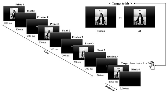 After the three images of visual stimuli were selected in the manipulation check, the experimental paradigm was composed of a practice block of four trials (two human and two AI trials) and a main block of 60 trials (30 human and 30 AI trials). The two types of target trials presented—human and AI trials—were randomly distributed. In both trials, a prime procedure with three agent images as primes (200 ms), which were followed by a blank (300 ms) and a fixation cross (200 ms for the presentation of the first and second images and 300 ms for that of the third image), and one of the three agent images and one of the two words (human or AI) as targets (onset of target trial: 2000 ms), followed by a blank (3000 ms), was employed (Figure 2). Furthermore, the same agent images with different agent identity information in text (human vs. AI) in the upper center of the screen were presented for the two target trials. In each of the 60 target trials lasting for 5000 ms, participants were asked to indicate whether they would consider it natural or unnatural for the displayed agent to provide them with recommendations in a symbolic consumption context, making this selection by pressing the keyboard button 1 or 2, respectively, with their right hand as quickly and accurately as possible. The behavioral responses were recorded only when participants responded within 5000 ms after the onset of the target stimuli. Participants received no feedback on their reaction times or whether their responses matched expectations, but those behavioral responses were recorded via the E-Prime software for preprocessing EEG signals.