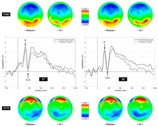 In this study, the amplitude of both early ERP components in response to visually presented stimuli, particularly within in the time window of P1 (70–130 ms) and N170 (150–200 ms), was measured at the P7 and P8 electrode sites. Although the P100 reflects a stimulus category effect, which is associated with low-level stimulus characteristics [36], top-down attention processes can affect P100 amplitude [37], indicating that the category-specific ERP responses can be observed. The text-specific visual processing was identified at the P7 electrode, and the face-specific visual processing was identified at the P8 electrode. To analyze the ERP responses based on the hypothesis that human agent-recommendations would be perceived as more natural than AI agent recommendations in the context of symbolic consumption, the ERP responses in which participants perceived human agent as natural and AI agent as unnatural were detected throughout the phase of segmentation during the EEG data preprocessing and used for the ERP analysis.